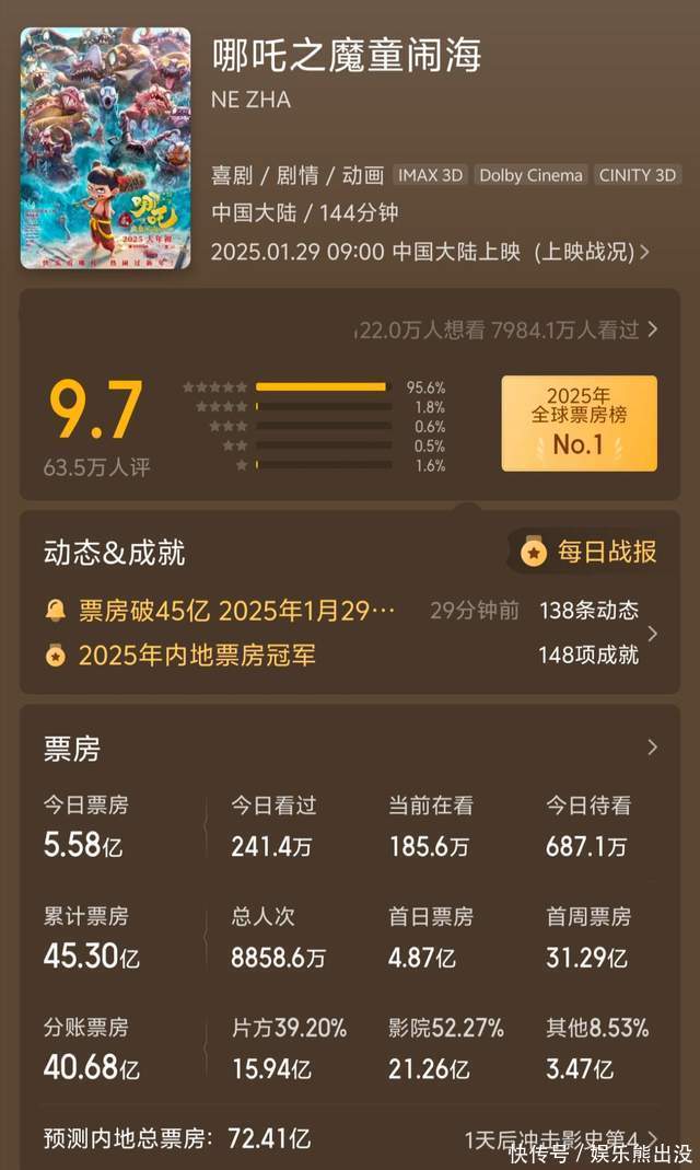 大年初七是春节档的最后一天,《哪吒之魔童闹海》在票房大战中实现了赢者通吃,目前累计票房为45亿,后续突破50亿乃至60亿也基本上十拿九稳了。